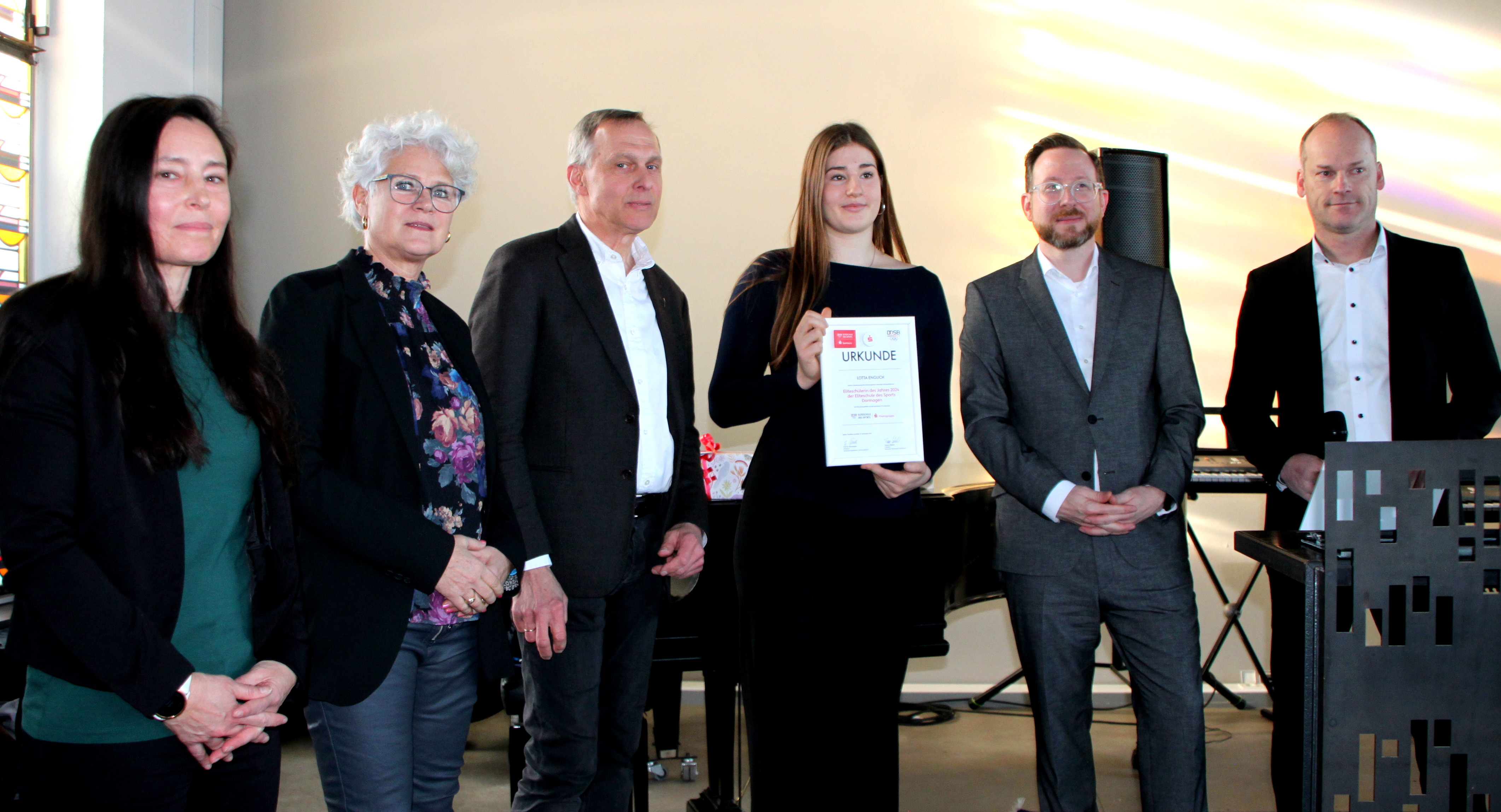Lotta Englich aus der Jahrgangsstufe Q2 des Norbert-Gymnasiums Knechtsteden (NGK) ist Dormagens erste „Eliteschülerin des Jahres“. Die Ringerin folgt auf Handballer Jan Schmidt, der bei der Premiere 2024 an der Bertha-von-Suttner Gesamtschule (BvS) ausgezeichnet wurde. Der Deutsche Olympische Sportbund (DOSB) hatte dem Verbundsystem beider Schulen vor anderthalb Jahren das Prädikat „Eliteschule des Sports“ verliehen. Dazu gehört die regelmäßige Auszeichnung eines Eliteschülers oder einer Eliteschülerin. 2024 war das bisher erfolgreichste Sportjahr der gebürtigen Wittenerin, die weiterhin für den KSV Witten 07 auf die Matte geht, aber am Bundesstützpunkt Dormagen trainiert: Sie wurde Deutsche Meisterin, gewann den EM-Titel bei den Juniorinnen und wurde in dieser Altersklasse WM-Dritte, erinnerte NGK-Schulleiter Johannes Gillrath an die sportliche Bilanz von Lotta Englich. Stéphanie Groß, Lehrerin, Koordinatorin Duale Karriere und ehemals selbst eine Weltklasseringerin, zeigte den Werdegang der damals in der 8b am NGK eingeschulten Athletin auf: „Heute bist du in Deutschland konkurrenzlos bei den Juniorinnen und ich bin fest davon überzeugt, dass dies auch in der Frauenklasse so weitergeht.“ Ringen sei zwar eine Individualsportart, „du hast aber bewiesen, dass du ein Teamplayer bist.“ Stéphi Groß begrüßte mit Jörg Helmdach und Heinz Schmitz auch zwei ihrer ehemaligen Trainer: „Schön, dass ihr mit eurer Anwesenheit die Bedeutung dieser Auszeichnung unterstreicht.“ Tobias Langner, Leiter des Sportinternats Knechtsteden, freute sich über die Würdigung von Lotta Englich: „Menschlich und persönlich hast du dich positiv weiterentwickelt und vor allem: Du bist immer Lotta geblieben.“ Hinweis Der DOSB und die Sparkassen-Finanzgruppe (SFG) zeichnen die Eliteschülerin des Jahres aus. Die SFG ist offizielle Förderin der Eliteschulen des Sports und unterstützt die Leistungssportler der Sportschule Dormagen durch die Übernahme von Kosten, die für die Mobilität und die Förderung der dualen Karriere anfallen.
